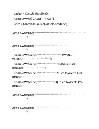 The document is a code example demonstrating the use of if-else conditional statements in a C# program. It handles user input for registering a gadget purchase and calculates the total price based on selected payment methods with discounts or interest rates. The program outputs the final price or an error message for invalid input.