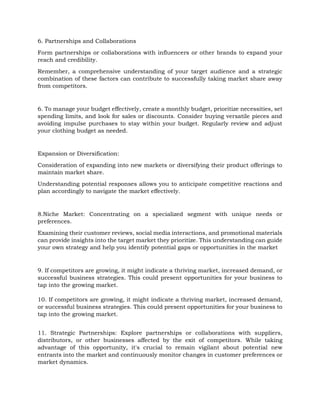 This document discusses strategies for a clothing business to manage strengths, weaknesses, customers' needs, objectives, marketing approaches, budget, expansion, niche markets, competitors' growth, strategic partnerships, and adaptability. The key strategies highlighted include leveraging strengths, improving weaknesses, understanding customer needs, aligning with objectives, using various marketing channels, managing budgets, considering expansion, targeting niche markets, partnering with other businesses, and adapting to market changes.