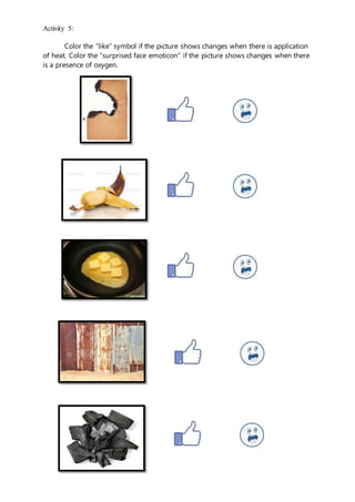 The document provides instructions to color code pictures that show changes from the application of heat or the presence of oxygen. Students are asked to color a "like" symbol next to pictures that change with heat and a "surprised face emoticon" next to pictures that change in the presence of oxygen.