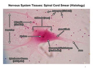 This document provides objectives and materials for an activity on the nervous system histology, brain, and cranial nerves. The activity involves identifying structures from slides and illustrations of nervous system tissue, as well as identifying brain structures and cranial nerves from models of human and sheep brains. The document includes numerous slides and illustrations of nervous system tissues, brain structures such as lobes, ventricles, and nuclei, as well as images of cranial nerves. It also provides information on the functions of various brain structures.