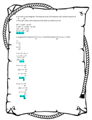 The document provides examples of problems involving tangents and secants of circles and their solutions. It gives real-life examples using bicycle gears, bridges, and other objects to represent circles, tangents, secants, and related geometric concepts. It then presents multiple multi-part problems involving finding measures of arcs, angles, segments and solving equations related to tangents and secants. The problems are solved step-by-step showing the work.