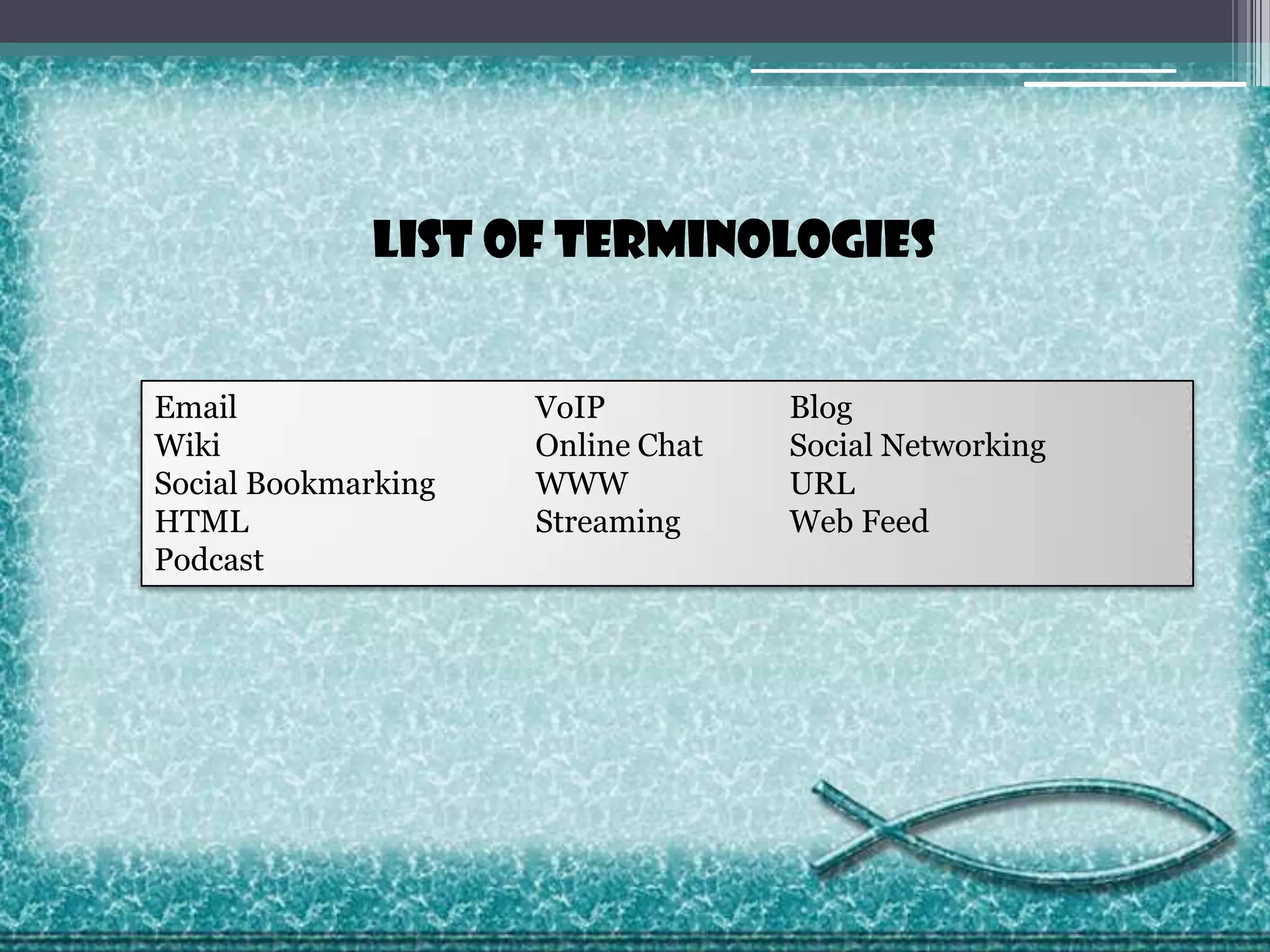 This document defines and describes common online terminology used on the internet. It includes definitions for 13 terms: email, wiki, social bookmarking, HTML, podcast, VoIP, online chat, WWW, streaming, blog, social networking, URL, and web feed. The definitions provide brief explanations of what each term refers to, such as that a wiki allows users to collaboratively edit website content, social bookmarking involves saving web pages for future access, and a blog is a website where users can post opinions and observations.