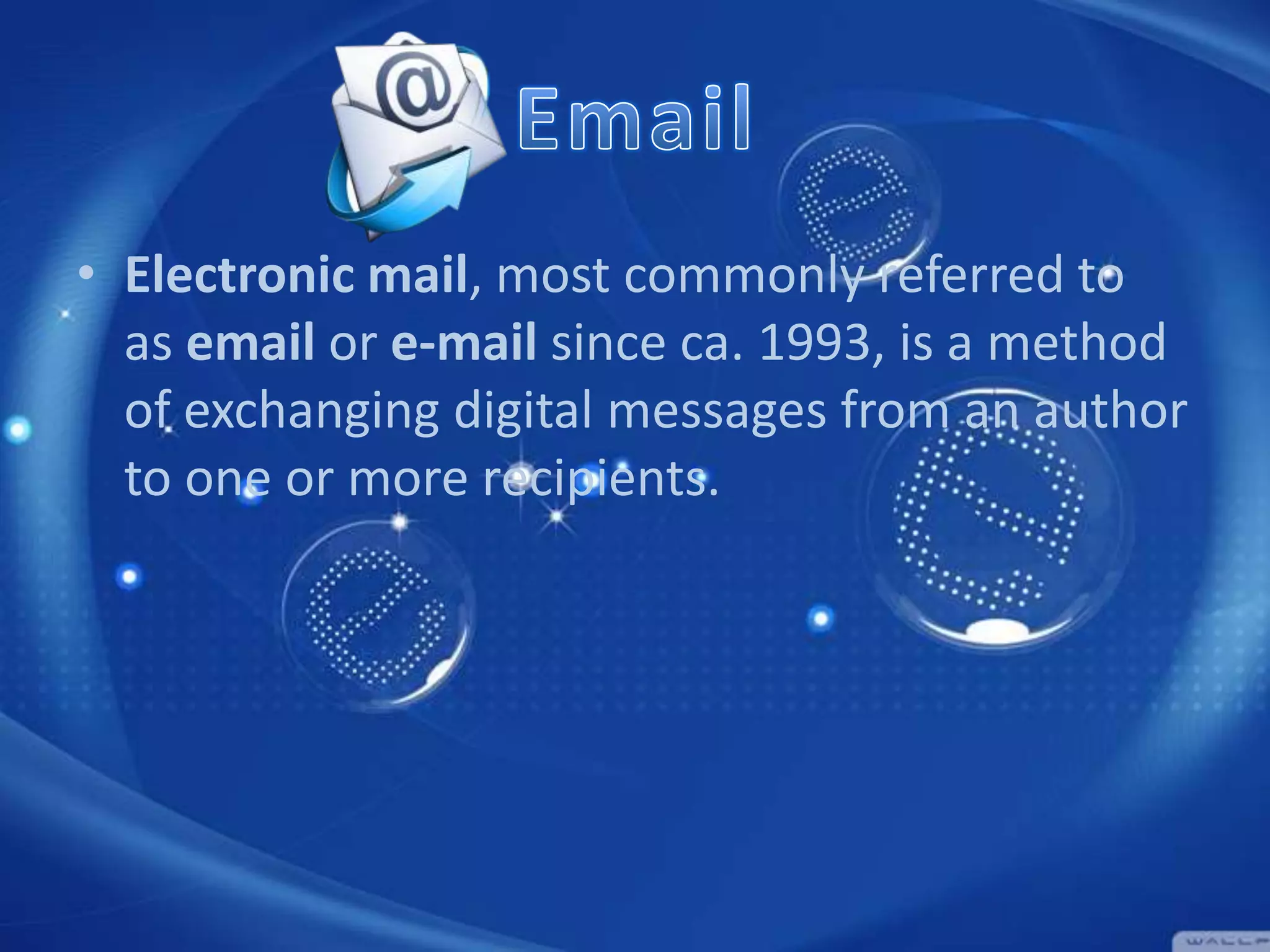 Electronic mail, commonly called email, allows digital messages to be exchanged between an author and recipients. A wiki is a website that allows users to add and update content using their web browser. Hypertext Markup Language (HTML) is the coding language used to write web pages so they display correctly.