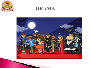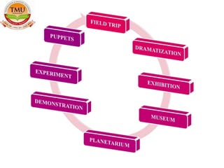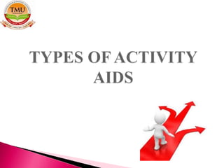The document discusses different teaching aids and their importance. It defines activity aids and their purposes, describing types like field trips and dramatization. Field trips provide hands-on learning outside the classroom and dramatization brings lessons to life through role playing and performances. The document outlines how these aids enhance learning and skills like cooperation, problem solving and confidence.