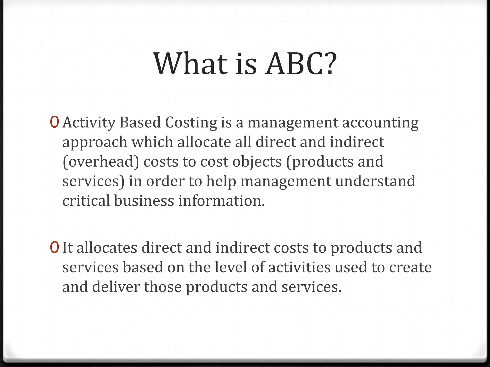 Activity based costing (ABC) is a management accounting approach that allocates direct and indirect costs to products and services based on the activities and resources required to produce them. It provides more accurate cost and profit information than traditional methods by tracing costs to activities and then to cost objects using activity drivers. The key steps in ABC are identifying activities and resources, assigning resource costs to activities, and assigning activity costs to cost objects using activity consumption drivers. This allows management to understand cost and profitability at a more granular level and improve decision making.
