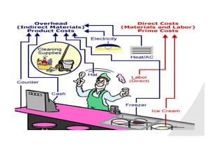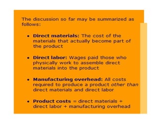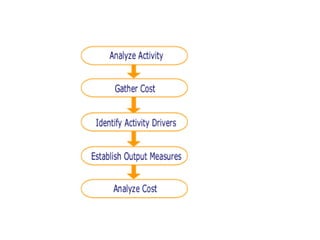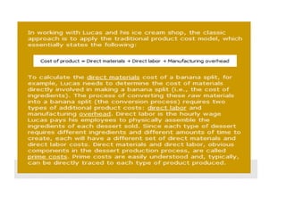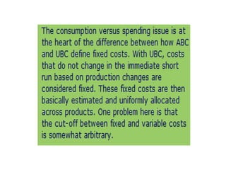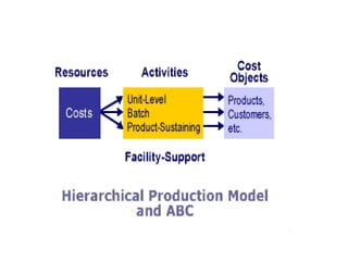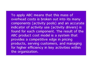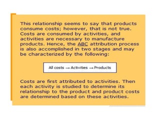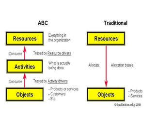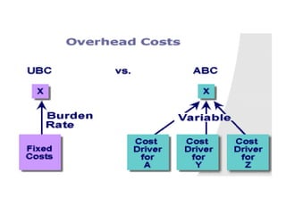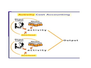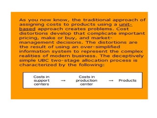 This document discusses traditional unit-based costing and activity-based costing approaches. Under traditional costing, overhead is allocated to products using a single predetermined rate based on direct labor hours. This can result in inaccurate and misleading product costs. Activity-based costing assigns overhead costs to cost pools or activity centers first, then assigns these costs to products based on cost drivers. The document provides a numerical example comparing overhead allocation and unit costs for two products under the traditional and activity-based costing methods.