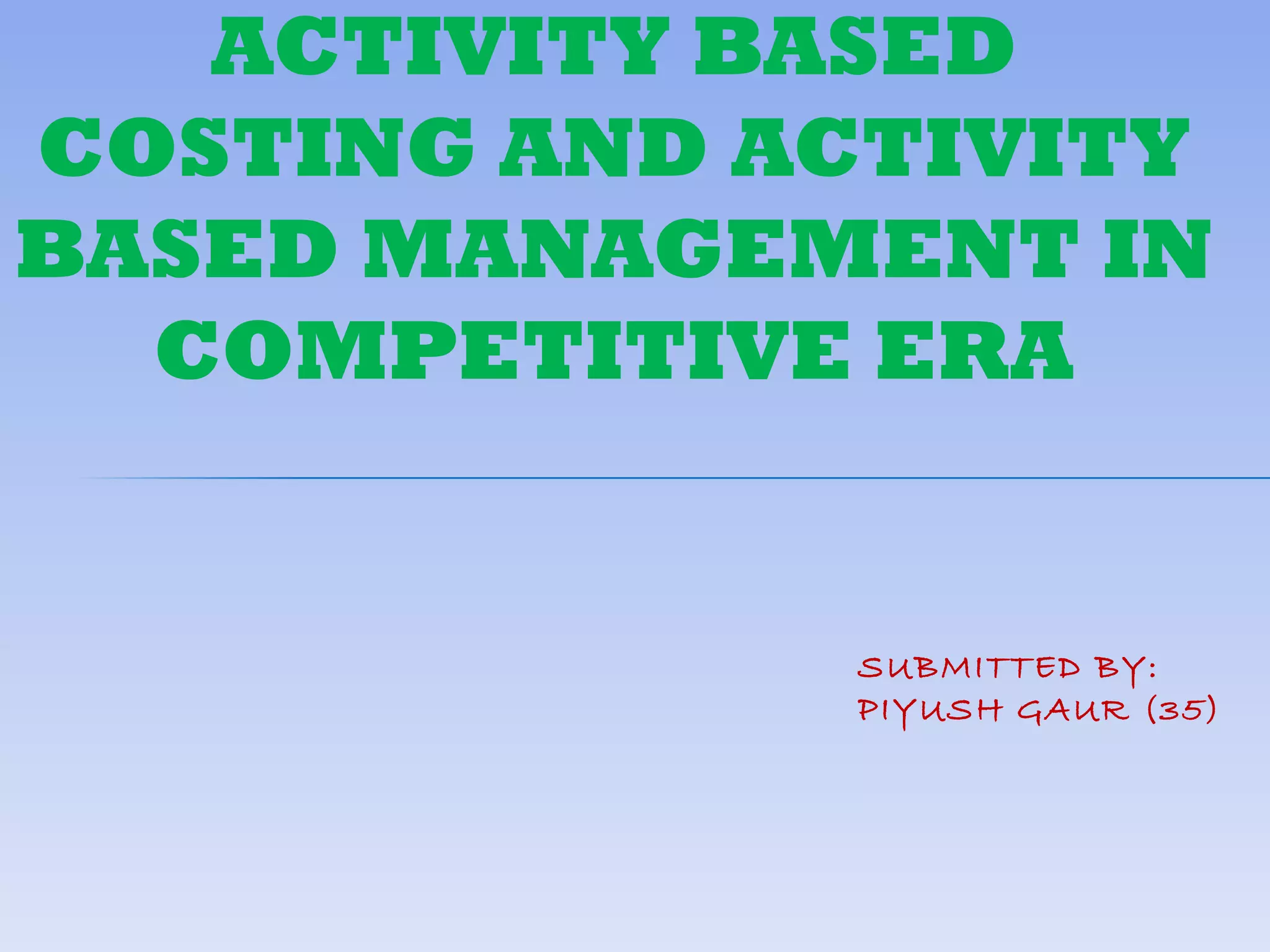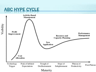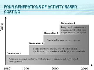 The document discusses activity based costing (ABC) and how it addresses limitations of traditional costing methods. It explains that ABC allocates overhead costs to products based on multiple cost drivers like direct labor hours, machine hours, and number of purchase orders rather than a single driver. This provides a more accurate reflection of how overhead resources are consumed. The document provides an example to illustrate how ABC can allocate overhead costs differently than traditional methods based on a single driver.