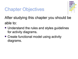 The document discusses activity diagrams, including their purpose, elements, notation, guidelines for creation, and an example. Activity diagrams can model tasks, system functions, and life cycles. Key elements include activities, transitions, decisions, and parallel paths. Notation includes rectangles for activities, arrows for transitions, diamonds for decisions, and bars for parallelism. Guidelines recommend setting context, identifying activities and flows, decisions, and parallelism. The example models scheduling appointments in a dentist office.