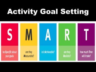 The document discusses experiential learning and goal setting for activities in an award program. It emphasizes that goals should be specific, measurable, achievable, realistic and time-bound (SMART) to help participants learn and grow through their engagement in planned activities. Goals are to be set with the participant, award leader and activity coach/assessor and reviewed periodically to ensure they remain realistic and motivating for the participant to complete their chosen activity.