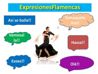 This document provides vocabulary related to flamenco dance and performance in Spanish. It lists common flamenco expressions used during performances like "Asi se baila!!" and "Olé!!" It also defines terms in flamenco vocabulary including "baile" which means dance, "falda" meaning skirt, and "zapateado" referring to foot stumping. Additional terms defined are various flamenco dance styles, parts of the body involved in dance, and places and events related to flamenco performances.