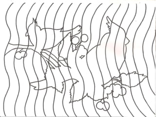 This document provides instructions for creating an op art drawing by first copying an outline image and then drawing wavy lines spaced 1-2 cm apart, alternating between drawing the lines in graphite pencil and erasing them to create a black and white pattern, which is then filled in with a black feltpen to complete the optical illusion art piece.