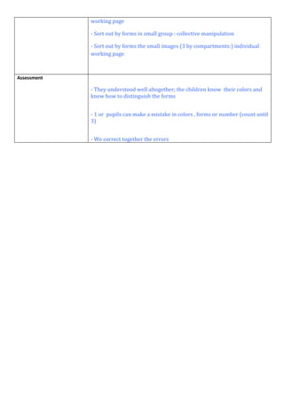 This document provides an activity plan for a pre-school education subject in France. The lesson involves sorting articles of clothing by color and shape. Young students will listen to a story, observe examples, and then practice sorting physical cutouts and images of clothing items like trousers, hats and flowers into groups by color and form, both as a group and individually. The objectives are to learn to categorize objects and assess if the students understand sorting by attributes.