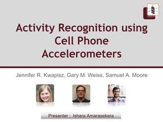 The document discusses a system for activity recognition using accelerometer data from mobile phones, highlighting its goal and contributions in the field. It details the data collection process, feature generation, and classification techniques used to achieve high accuracy in recognizing physical activities, reaching over 90% for common activities like walking and jogging. The findings emphasize the potential of mobile devices in data mining and the opportunities for future applications.