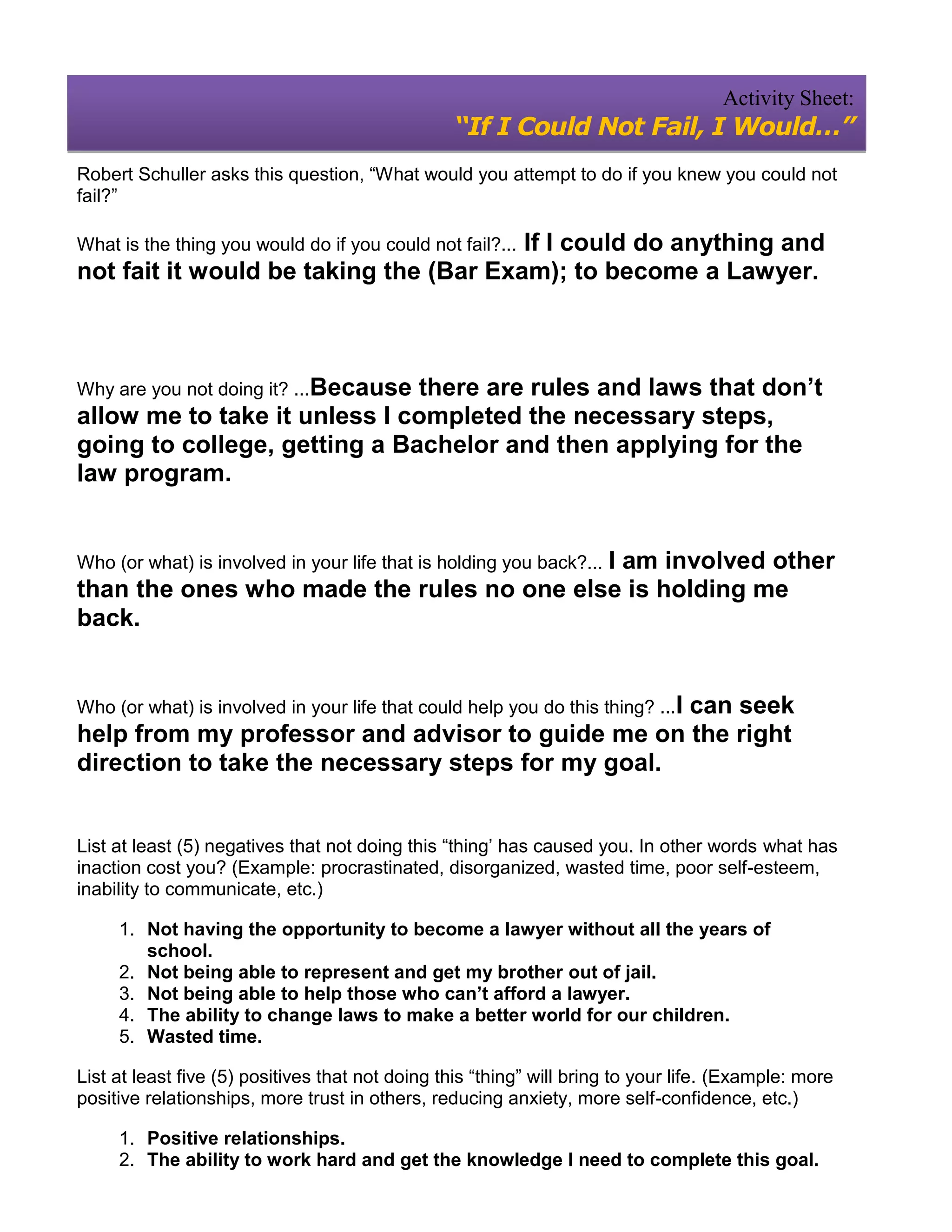 The document outlines a goal of becoming a lawyer by taking the Bar Exam. However, the individual cannot currently take the exam without first completing college and a law degree program. The negatives of not pursuing this goal include missed opportunities to become a lawyer and help others through legal representation. The positives of not pursuing it yet include gaining knowledge and experience through college to improve skills. The individual plans to register for college, obtain a bachelor's degree, attend law school, pass the bar exam, and graduate as a lawyer working at a law firm.