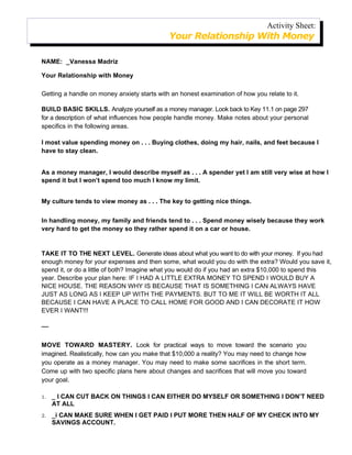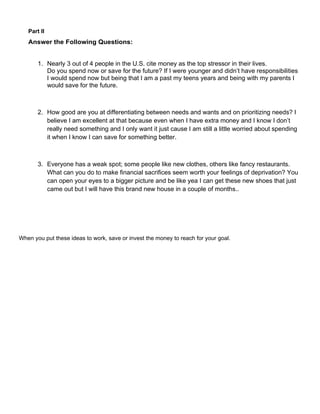 Vanessa wants to buy a house if she had $10,000 extra to spend this year. She views owning a home as something that can be hers permanently as long as she makes payments. To achieve this goal, Vanessa plans to cut back on unnecessary spending and put over half of each paycheck into savings. She will make financial sacrifices now to work towards owning a home in the future.