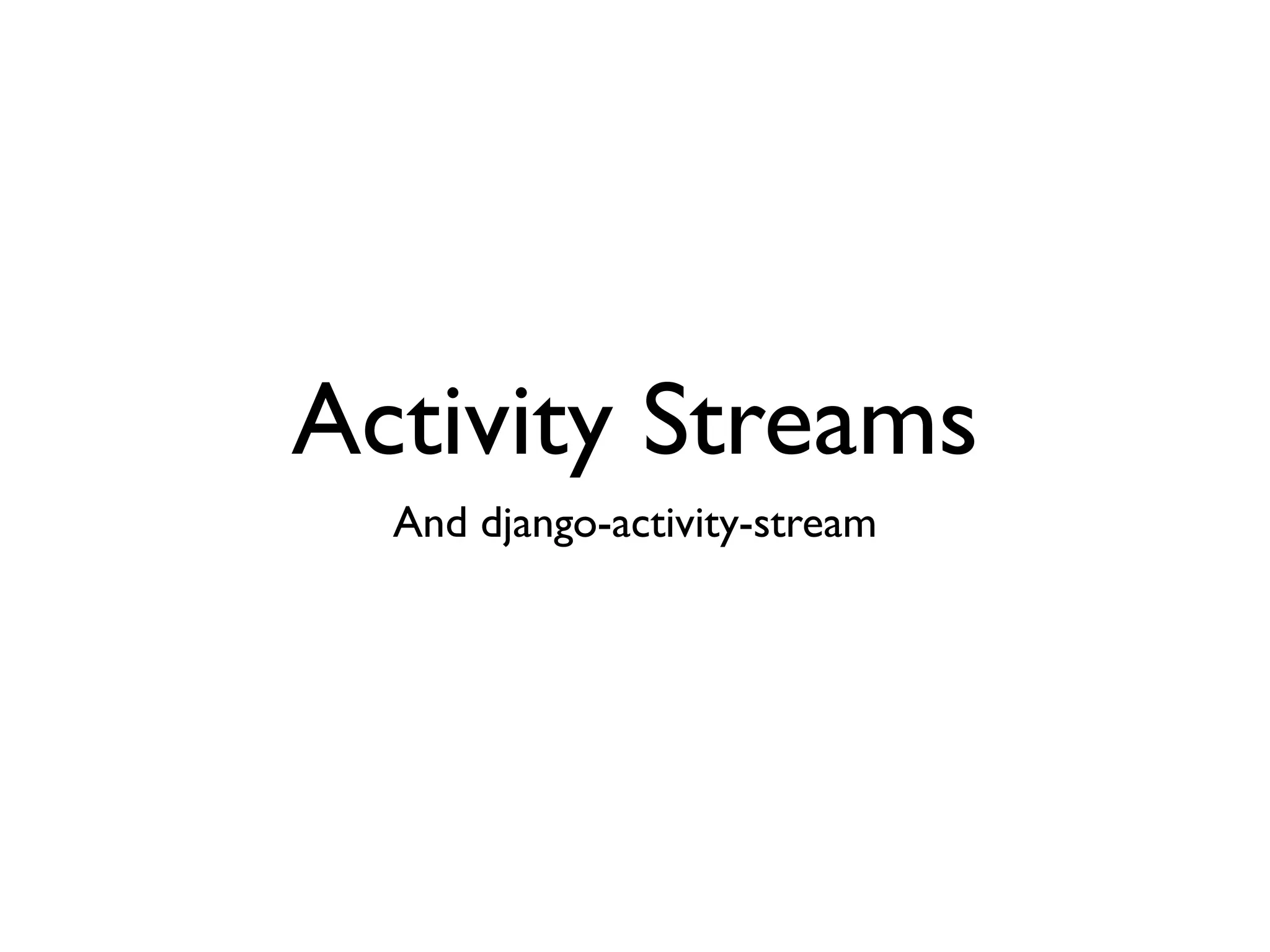 This document discusses activity streams and the django-activity-stream library. It introduces activity streams as a way to track actions and events. The django-activity-stream library allows integrating activity streams into Django projects with a single API call to log actions and a URL pattern to include the activity feed. It supports feeds in Atom format and provides links to the GitHub repositories for the original and a forked version of the library.