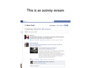 This document discusses activity streams and the django-activity-stream library. It introduces activity streams as a way to track actions and events. The django-activity-stream library allows integrating activity streams into Django projects with a single API call to log actions and a URL pattern to include the activity feed. It supports feeds in Atom format and provides links to the GitHub repositories for the original and a forked version of the library.