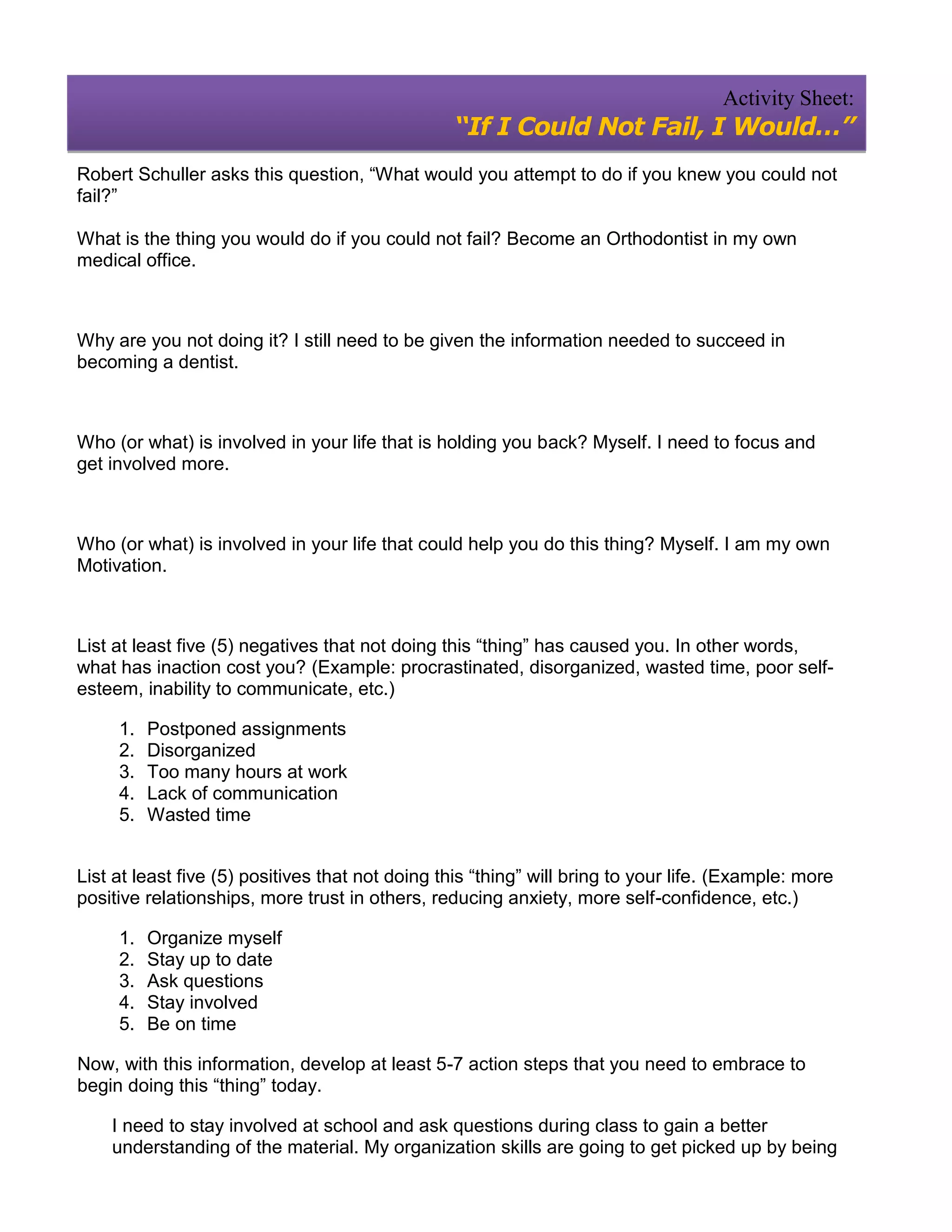 The document is an activity sheet where the respondent outlines their goal of becoming an orthodontist. They acknowledge that currently they need more information to succeed in becoming a dentist first. The respondent identifies that the only thing holding them back is themselves and that they are their own motivation. To achieve this goal, they list action steps like staying involved in class, asking questions, improving organization, and creating to-do lists.