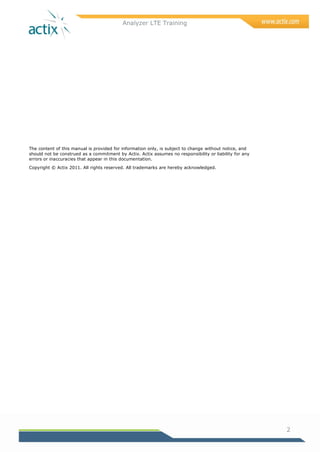 This document provides an overview of an Analyzer LTE training course. The course teaches participants how to use the Spotlight and Analyzer software to analyze LTE network performance data and troubleshoot issues. It introduces key features of Spotlight and Analyzer, how to navigate the user interfaces, perform various analyses like coverage analysis and throughput analysis, and customize reports. The goal is to help users identify and address network problems to improve quality of service for subscribers.