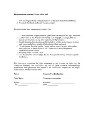 The production company Numero Uno will not be responsible for any injuries to the actor during filming and will conduct full health and safety risk assessments, while the actor guarantees their availability for all agreed upon performances and authorizes Numero Uno to use their image, voice, and likeness in marketing materials for the film, with this agreement superseding any prior contracts between the actor and production company.