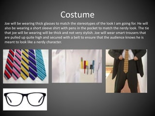 Joe will play the sole actor in the video portraying a nerdy character. He will have his hair slicked back or parted with thick glasses to emphasize the stereotypical nerdy look. Joe will wear a short-sleeve button-down shirt with pens in the pocket, thick tie, and smart trousers pulled up high to complete the costume. Props will include a desk surrounded by paperwork, a pot of pens, and a clock to set the scene of a bored office worker.