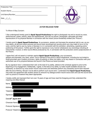 The actor release form grants Squid Squad Productions the perpetual right to use the actor's image, voice recordings, name and likeness in connection with the motion picture. It allows Squid Squad Productions to photograph and record the actor, as well as use these recordings and images to promote and distribute the film. The actor agrees not to make any legal claims regarding the use of their image or voice and understands they must make themselves available for additional voice recording or sound work if needed after filming.