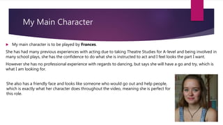 The document discusses the casting choices for various roles in a music video. Frances was chosen as the main character due to her acting experience. Elishia was selected as the singer for her caring face and some singing experience. Beth and Karis were chosen as professional dancers due to their dance competition experience. Sam was picked as the doubting character because he has acting experience and knows Frances. Mike, Jack and Eleanor were selected as the bullies due to intimidating heights and previous experience playing similar roles. Cameron will play the victim role due to his acting experience. Emily was chosen as the love heart character for her loving face. Ben will play the sad to happy character since he can convey those emotions with limited experience. Minimal props may