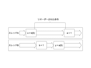 Editor's Notes #2 \n #3 \n #4 \n #5 \n #6 \n #7 \n #8 巻き上げ。最適化していいことになっているから、\n #9 \n #10 スレッドAで書き込んだら、次のスレッドBで読み込めるとは限らない。\n #11 スレッドAで書き込んだら、次のスレッドBで読み込めるとは限らない。\n #12 スレッドAで書き込んだら、次のスレッドBで読み込めるとは限らない。\n #13 スレッドAで書き込んだら、次のスレッドBで読み込めるとは限らない。\n #14 \n #15 \n #16 \n #17 \n #18 \n #19 \n #20 \n #21 \n #22 \n #23 (1)のVolatile Storeの結果が(2)のVolatile Loadで見えることが保証される。volatileでなくてもAtomicBooleanでもよいですね。可変な変数はいろいろややこしい。\n #24 二つのスレッドが同時で動いたとしたら、x, yの結果はどうなりますか。\n #25 同期化したメモリアクセスではないので、スレッドのスケジューリング次第で運任せ。\n #26 結構な頻度でおこります。\n #27 理屈はこうです。スレッドAの命令がリオーダーされた場合は0,0となります。\n #28 \n #29 \n #30 このように、そもそも人間のメンタルモデルから遠いノウハウを要求されてしまうのが、共有データ・ロックモデルです。ですから、本当にスレッドセーフで、スループットの出る マルチスレッドプログラミングができるプログラマは非常に少ないですし、これから目指すのも難しいということが言えます。\n #31 \n #32 共有データロックモデルは簡単にデットロックを引き起こしてしまう可能性があるが、アクターは回避しやすい。これからは並行処理は、アクターから考えるべきです。\n #33 メッセージパッシングによる抽象度の高い並行処理モデルが、アクターモデルです。アクターとしてはErlangが有名。アクターはスレッドとメールボックスが一体になったようなオブジェクトです。アクターに何かを依頼するときはメッセージを送信します。アクターで受信したメッセージはキューで管理され、キューから取り出されたメッセージに応じた処理が実行されます。\n #34 リソースを共有しないので、シングルスレッドモデルでよいのです。\n #35 \n #36 \n #37 actorという関数を引数に取るファクトリメソッド。\n #38 receiveはブロックします。実行効率が悪い。もっと実行効率を上げるにはreactを使います。\n通常はアクターにはスレッドが割当てられます。 スレッドはたくさん作るとOutOfMemoryErrorを引き起こします。Javaで学んだようにスレッドをプーリングしてスレッドを再利用しなければなりません。reactはブロックせずに、スレッドを再利用します。ほとんどreceiveと同じことができますが、メッセージを処理しても制御を返しません。カレントスレッドは、次のアクターのために再利用されます。プログラム内のすべてのアクターがreactを使うなら1つのスレッド実行しようとします。ただし、コアの数によります。\n #39 リソースを共有しないので、メッセージだけで通信していれば、シングルスレッドモデルでよいのです。\n #40 しかし、落とし穴があってメッセージオブジェクトがmutableだとつらいことになります。とにかくImmutableにしないといろいろ面倒なことを考慮しないと、死にます。\n #41 \n #42 同時複数のスレッドが同じ値を取得し、立て続けに加算した場合想定が崩れる。リードモディファイライトが、、\n #43 同時複数のスレッドが同じ値を取得し、立て続けに加算した場合想定が崩れる。リードモディファイライトが、、\n #44 結構な頻度でおこります。\n #45 同時複数のスレッドが同じ値を取得し、立て続けに加算した場合想定が崩れる。リードモディファイライトが、、\n #46 \n #47 同時複数のスレッドが同じ値を取得し、立て続けに加算した場合想定が崩れる。リードモディファイライトが、、\n #48 ロックを取得しないでアトミックな操作ができる。実行中のメモリIOを記録し、共有メモリに対しての変更を行う。\nロックがあればスレッド間の調停を行うが、この場合の整合性の検証は書き込み側ではなく、読み込み側に責任がある。トランザクション完了後に読み込み側で、他のスレッドで変更されていないかを検証させる。問題なければコミット、問題あればロールバックされてatomicの式は最初からやり直しになる。\n何がよいのかは、ロックコストを削減と、プログラムがわかりやすくなる。シングルスレッドで考慮すればいいか。デッドロック全く起きないか、トランザクションマネージャによって管理されているので安全です。\n\n