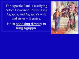 Paul was testifying before King Agrippa about his former life persecuting Christians and his conversion experience on the road to Damascus. He saw a bright light and heard Jesus say "Why do you persecute me?" realizing that in persecuting Christians he was persecuting Jesus. Paul was once a persecutor of Christians but was now a believer in Jesus as the Messiah.