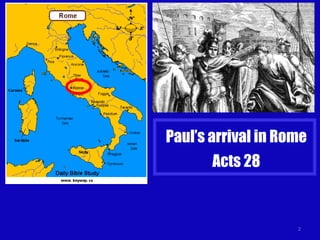 Paul arrived in Rome under guard and was allowed to live in his own rented home with a soldier. He called the Jewish leaders to meet with him and explained that he had done nothing wrong against Jewish law or customs. Some believed Paul's message about Jesus being the Messiah while others did not. Paul lived in Rome for two years preaching about Jesus and the Kingdom of God. During this time, he wrote letters that became the Prison Epistles of the New Testament.