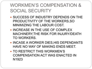 This document summarizes key labor laws and acts in India related to workmen's compensation and social security, including the Workmen's Compensation Act of 1923 and Employees' State Insurance Act of 1948. It also discusses a series of Factory Acts passed in Britain between 1802-1937 to regulate child labor and working hours/conditions in textile mills, which were later adopted and modified in India. The acts established minimum employment ages, limited working hours, mandated health and safety standards, and introduced employer liability for work-related injuries.