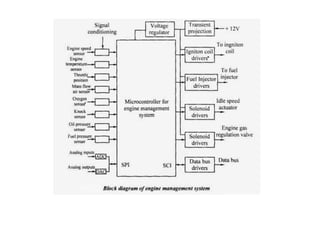 The document discusses the components and functioning of an engine management system. It describes the electronic control unit that oversees all electronic systems in a vehicle. It also explains the fuel injection system that stores and supplies fuel for combustion and the ignition system that generates sparks for ignition. Finally, it provides details on the various sensors used in the engine management system, including throttle position, oxygen, manifold pressure, temperature, engine speed, exhaust gas, mass air flow, and knock sensors and what each measures.
