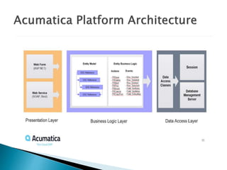 Acumatica is a cloud-based ERP software designed for small and medium-sized businesses, founded in 2008 and headquartered in Bellevue, Washington. It features real-time transaction processing and offers various business suites including financial management, customer management, and project accounting, while also providing flexible scalability and responsive support. Acumatica has shown significant revenue growth and maintains a global presence with over 5200 customers.