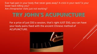 Acupuncture is an ancient Chinese healing technique that involves inserting thin needles into specific points on the body to relieve pain and treat various health conditions. It works by unblocking disruptions in the flow of "qi", or life energy, through pathways called meridians. A session at John's Acupuncture clinic can help fix pains like neck or back issues for $50. Testimonials from past clients report relief from shoulder pain, migraines, and improved mobility.