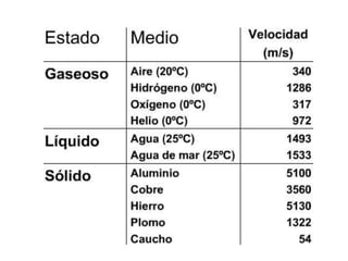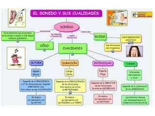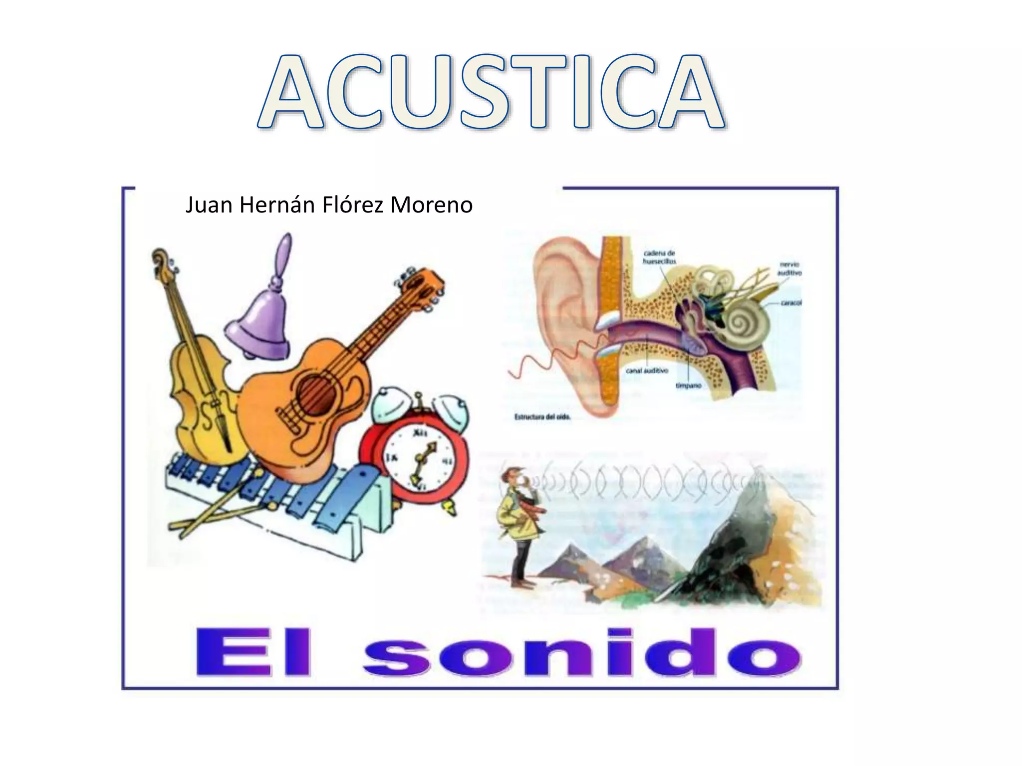 El documento trata sobre acústica y la producción y propagación del sonido. Explica que el sonido es una vibración mecánica que requiere de un medio físico para propagarse y que cuando un objeto vibra, transmite esa vibración al aire circundante, la cual llega al oído provocando la vibración del tímpano y los huesecillos, codificándose la información en el cerebro como sensación de sonido. También describe las propiedades del sonido como frecuencia, intensidad y velocidad, así como diferentes tipos