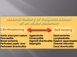 1) Differential diagnosis for acute abdomen is wide, ranging from life-threatening to benign conditions. Management varies from emergency surgery to reassurance depending on diagnosis.