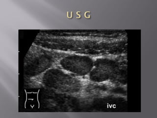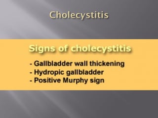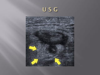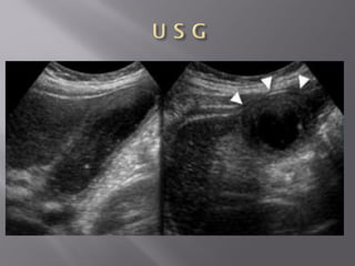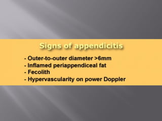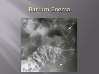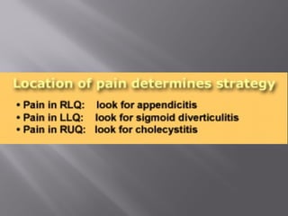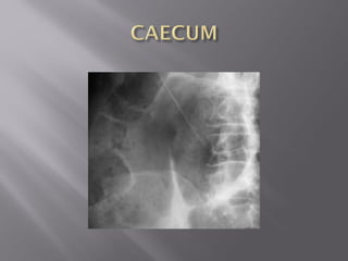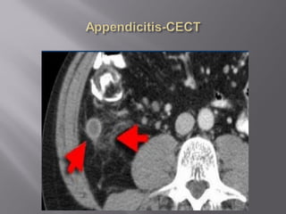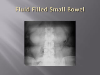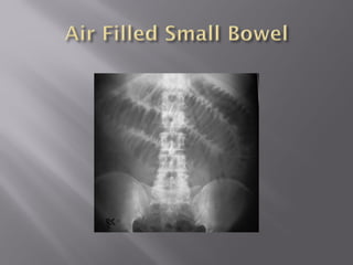 4) The document then discusses various x-ray findings that help diagnose conditions like perforation, obstruction, appendicitis, diverticulitis, and others.