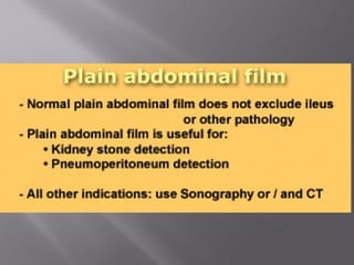 3) A plain abdominal x-ray has limited value and may falsely reassure as normal does not rule out pathology.