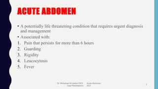 The document presents case studies on acute abdomen, highlighting its urgency and the importance of timely diagnosis and management. It discusses various conditions associated with acute abdomen, such as abdominal aortic aneurysm, toxic megacolon, sigmoid volvulus, and ectopic pregnancy, detailing symptoms, diagnostic imaging, and treatment approaches. Key takeaways include the need for rapid evaluation, pre-operative optimization, and considerations for surgical intervention.