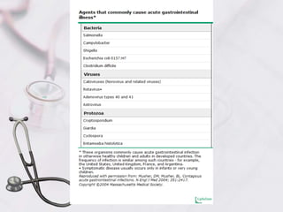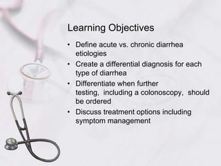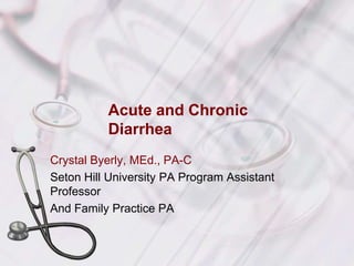 This document defines acute and chronic diarrhea and outlines their etiologies and treatment approaches. Acute diarrhea is typically infectious in nature and lasts less than 3 weeks, with the most common causes being viruses, bacteria, parasites, and protozoa. Chronic diarrhea lasts over 4 weeks and can be due to malabsorption, secretory causes, or inflammation. The document provides detailed information on evaluating, diagnosing, and managing different causes of acute and chronic diarrhea.