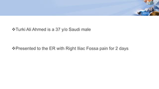 Turki Ali Ahmed, a 37-year old Saudi male, presented to the emergency room with sharp right lower quadrant pain for two days. On examination, he had tenderness in the right lower quadrant with rebound and other signs positive for acute appendicitis. Laboratory tests showed elevated white blood cell count. The differential diagnosis included appendicitis, testicular torsion, urinary tract infection, kidney stones, and inflammatory bowel disease. Given the clinical findings, appendicitis was considered provisional. The patient was admitted for IV fluids, NPO status, and pre-op management. He then underwent an open appendectomy and was started on IV antibiotics and pain medications post-surgery.