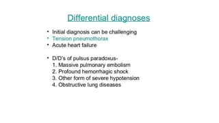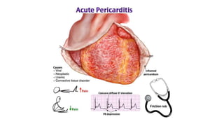 The document provides an overview of the management of acute cardiovascular disorders including sudden cardiac arrest, shock, heart failure, pericardial tamponade, and dysrhythmias. Key points discussed include the importance of high-quality CPR with minimal interruptions, use of epinephrine and vasopressors in cardiac arrest and shock, identification and treatment of different shock types, and techniques for pericardiocentesis. General principles of shock management are outlined focusing on initial volume resuscitation and considering the cause of shock when determining appropriate treatment.