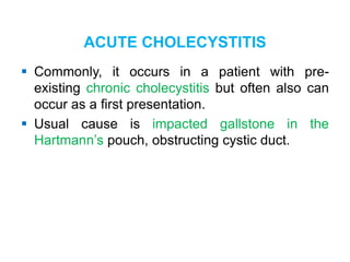 This document discusses acute cholecystitis, which is inflammation of the gallbladder commonly caused by an impacted gallstone obstructing the cystic duct. It presents the typical causative bacteria, clinical features including pain and fever, investigations such as ultrasound and CT scan, complications, differential diagnoses, and treatments including antibiotics and cholecystectomy. It also briefly covers empyema gallbladder, which is acute cholecystitis with pus in the gallbladder, and mucocele of the gallbladder, which is gallbladder distention without infection due to cystic duct obstruction.