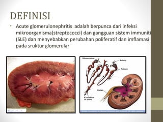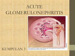 Dokumen tersebut membahas tentang acute glomerulonephritis, yaitu peradangan pada glomerulus yang disebabkan oleh infeksi atau penyakit sistemik. Terdapat dua jenis glomerulonephritis, yaitu primer yang disebabkan respons imun terhadap patogen dan sekunder yang disebabkan penyakit sistemik. Gejala klinisnya meliputi demam, nyeri, hematuria, edema. Pengobatannya meliputi diet rendah garam dan protein, diuretik, antibiotik,