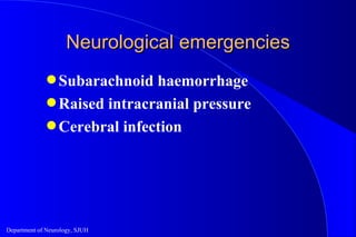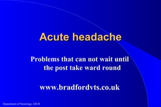 The document discusses various types of acute headaches that require urgent evaluation in the emergency department. It covers neurological emergencies that can cause acute headaches like subarachnoid hemorrhage and raised intracranial pressure. The most important part of evaluating acute headaches is taking a thorough history. It then describes characteristics of different headache types like migraines, cluster headaches, and tension headaches that may present acutely. It highlights that a CT scan identified subarachnoid hemorrhage, intracerebral hemorrhage, and meningitis as causes of sudden onset headaches in some emergency department patients.