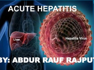 Acute hepatitis can be caused by viruses, toxins, drugs, or autoimmune processes. The most common causes are viral hepatitis A, E, B, C, and D. Hepatitis A and E are usually self-limiting and do not result in chronic liver disease. Hepatitis B, C, and D can become chronic, increasing the risk of cirrhosis and liver cancer. Symptoms of acute hepatitis include fatigue, nausea, abdominal pain, and jaundice. Treatment focuses on relieving symptoms; vaccination helps prevent hepatitis A and B. Complications can include liver failure, chronic liver disease, or aplastic anemia.