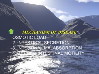 This document discusses acute infectious diarrhea. It defines it as an alteration of normal gastrointestinal function caused by ingested microorganisms or their toxins. The mechanisms of disease include osmotic load, intestinal secretion, malabsorption, and altered motility. Common causes are discussed such as ETEC, Salmonella, Campylobacter, Shigella, and viruses. Symptoms, diagnostic testing, treatment, and prevention are covered. Management involves rehydration and use of antimicrobials in some cases.