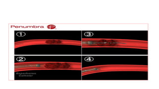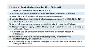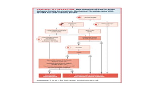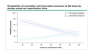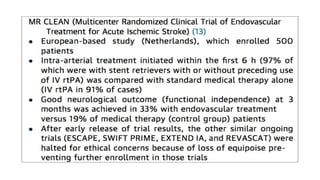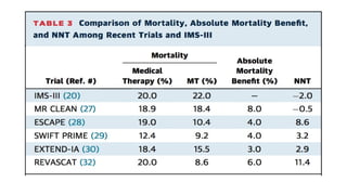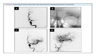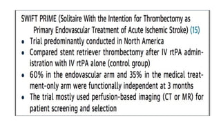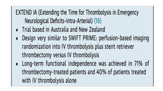 The document discusses the evolution of treatments for acute ischemic stroke (AIS), including intravenous thrombolysis and mechanical thrombectomy. It summarizes key randomized trials that established the benefits of mechanical thrombectomy. The first-generation trials using early thrombectomy devices did not show benefit, but recent trials using stent retrievers demonstrated significantly improved recanalization rates and superior outcomes for mechanical thrombectomy combined with intravenous thrombolysis compared to intravenous thrombolysis alone in eligible patients presenting within 6 hours of stroke onset. The document concludes that mechanical thrombectomy is now a standard treatment for AIS but remains underutilized.