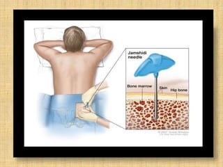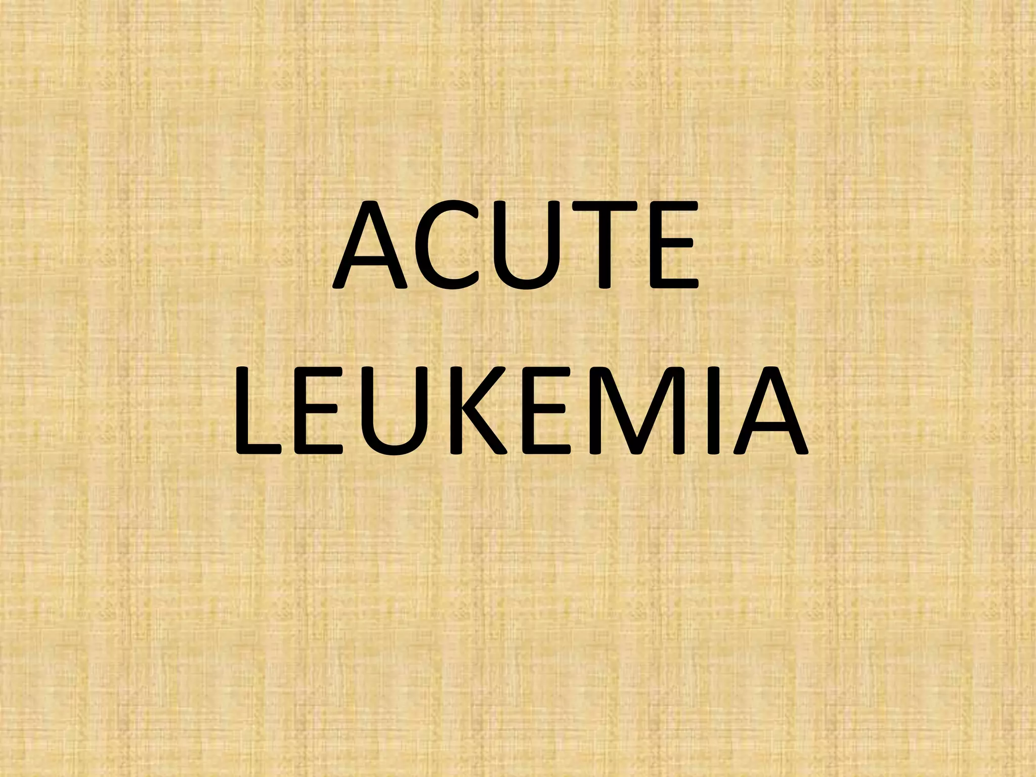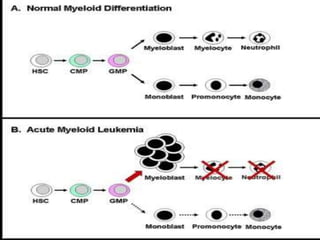 Acute leukemia is a malignant clonal disorder characterized by the accumulation of immature blast cells in the bone marrow, which replaces normal marrow tissue and results in bone marrow failure and peripheral blood cytopenias. There are two main types: acute lymphoblastic leukemia (ALL) and acute myeloid leukemia (AML). ALL involves abnormal proliferation of immature lymphocytes while AML involves the myeloid cell lineages. Diagnosis involves physical exam, blood tests, bone marrow aspiration and biopsy. Treatment for both types usually involves intensive multi-agent chemotherapy, while AML may also involve all-trans retinoic acid. Prognosis depends on various risk factors like age, white blood cell count, and cytogenetics.