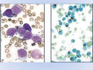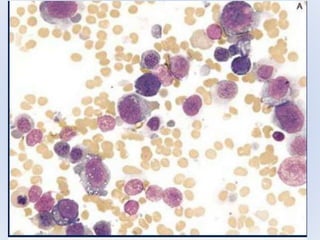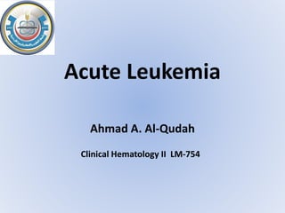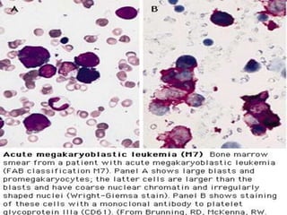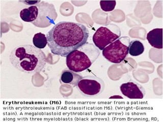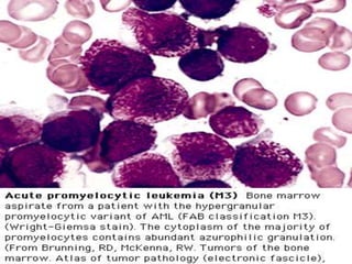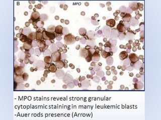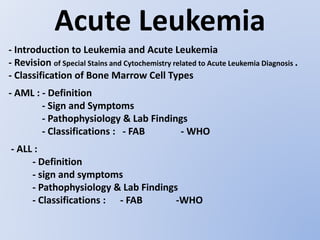 Acute myeloid leukemia (AML) is a type of acute leukemia characterized by the rapid growth of abnormal white blood cells that build up in the bone marrow and blood. The document discusses the pathophysiology, signs and symptoms, laboratory findings, and classifications of AML according to the French-American-British (FAB) and World Health Organization (WHO) systems. It defines eight subtypes of AML under the FAB classification based on morphological criteria and immunophenotyping.